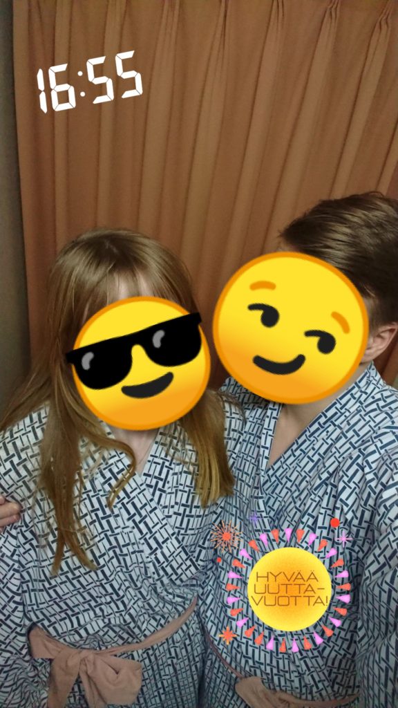 Viimeisin juhlahetki tuli vietettyä perinteisesti sisustetussa tatamihuoneessa television laskiessa sekunteja alaspäin ja kuohuva sakepullo kädessä yukata päällä. Ikkunasta avautui näkymä Tokion Sky Treelle jossa vuoden vaihduttua muuttuivat värit upeasti.